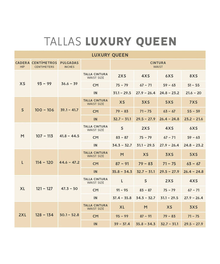 Faja Colombiana para caderas anchas Luxury Queen, cuenta con un sistema de dos tallas. El primero hace referencia a las caderas donde tendremos tallas XS, S, M, L, XL y 2XL. La segunda medida corresponde a la cintura que desees elegir según tu medida.
