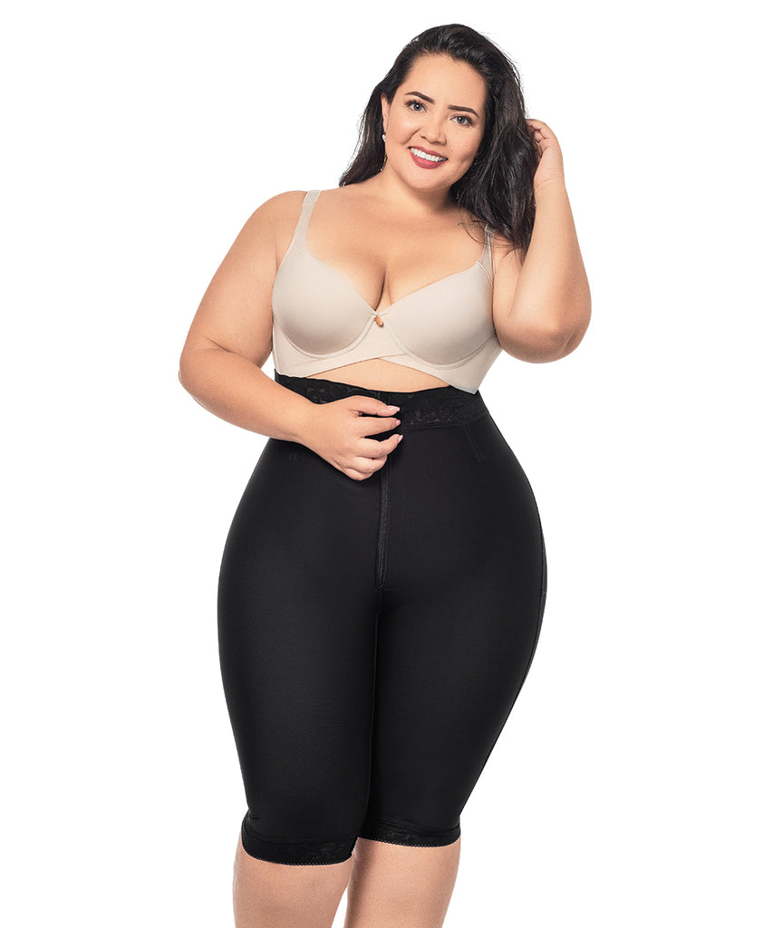 Forma Tu Cuerpo presenta su short a la rodilla en color negro, especialmente diseñado para controlar el abdomen bajo, levantar glúteos y moldear las piernas. Incluye delicado encaje y bandas siliconadas que evitan que la prenda se enrolle.